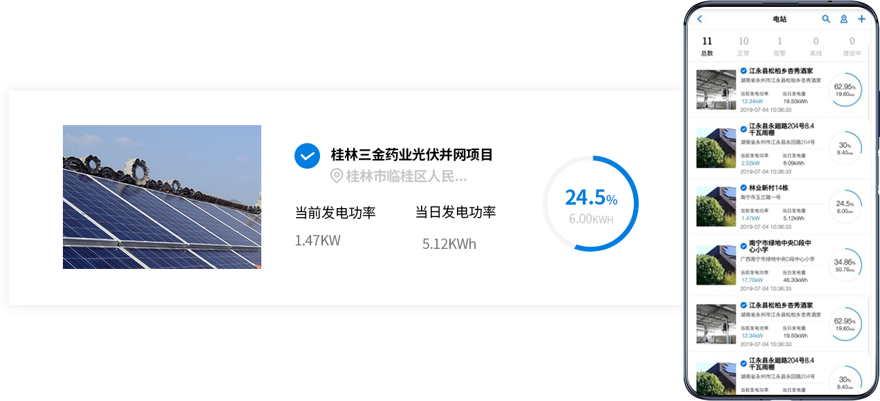 光伏发电监控系统能实时监控电站发电量、输出功率、逆变器功率,能监控环境温度、风速、光照强度等参数,还能监控逆变器、温度传感器、功率质量测量仪等设备状态及报警信息。系统提供丰富的VGA、LED、手机APP、网络远程监控和自定义报表等高级功能,用户可根据需要随时查看电站当天及以往的运行情况。